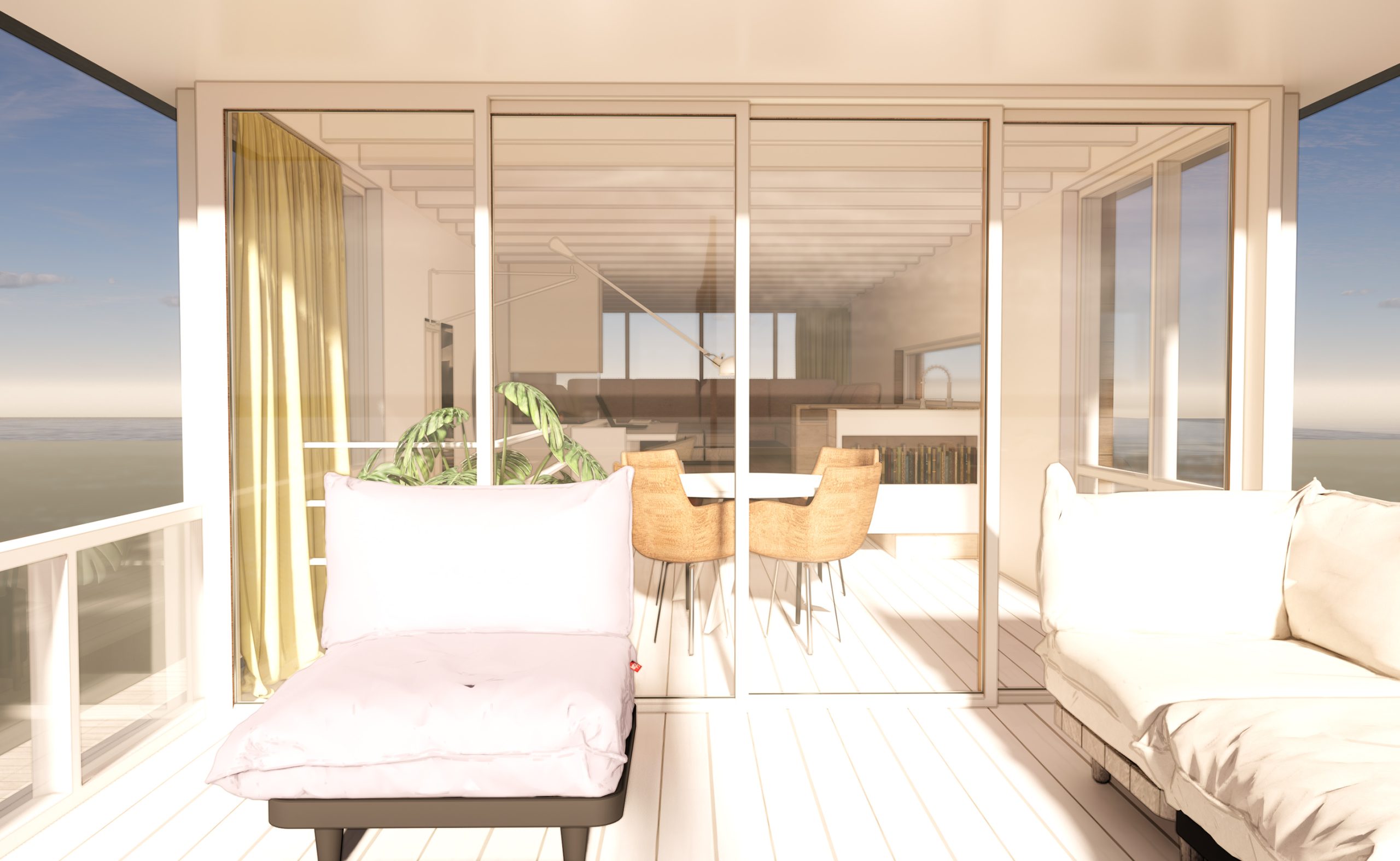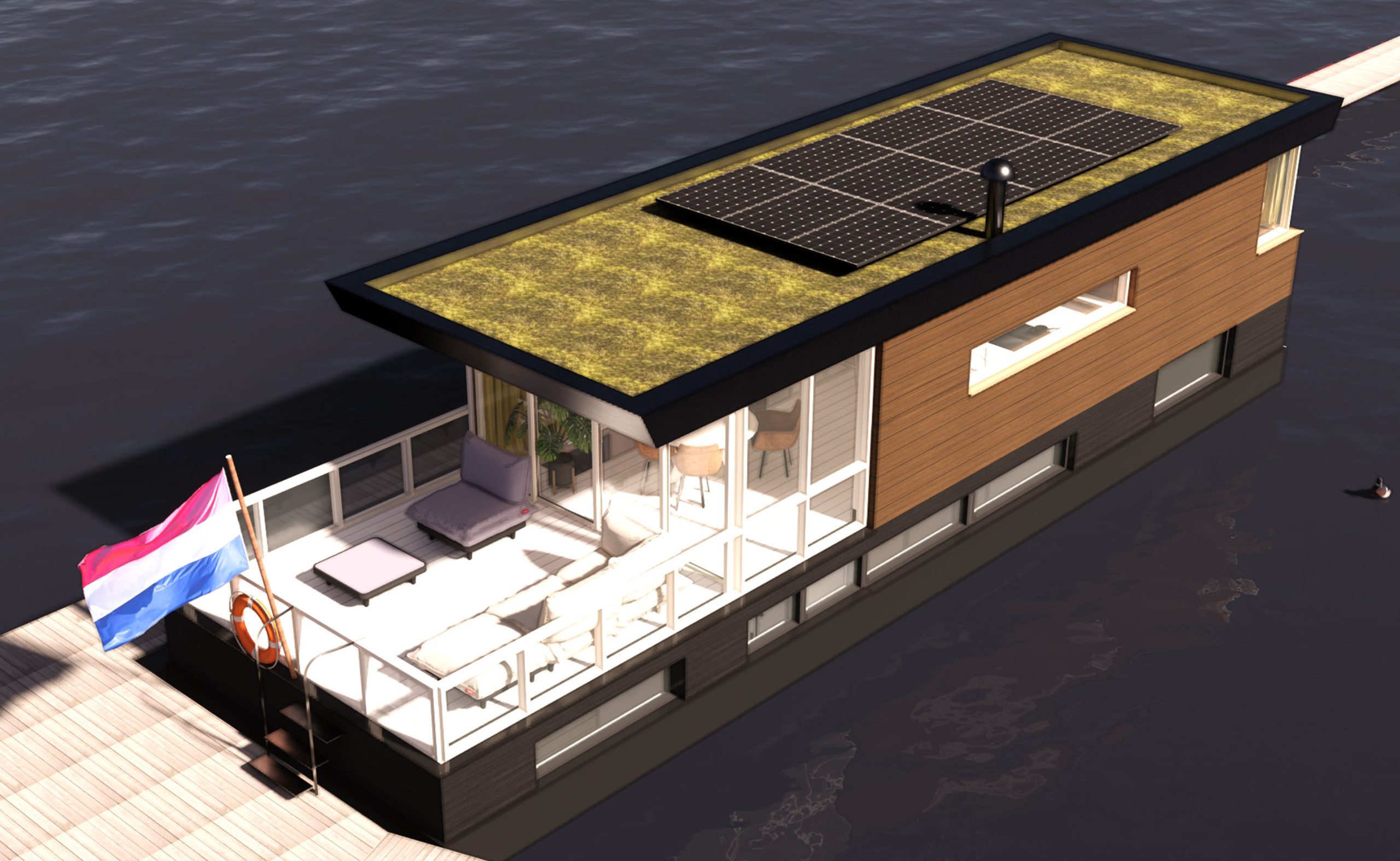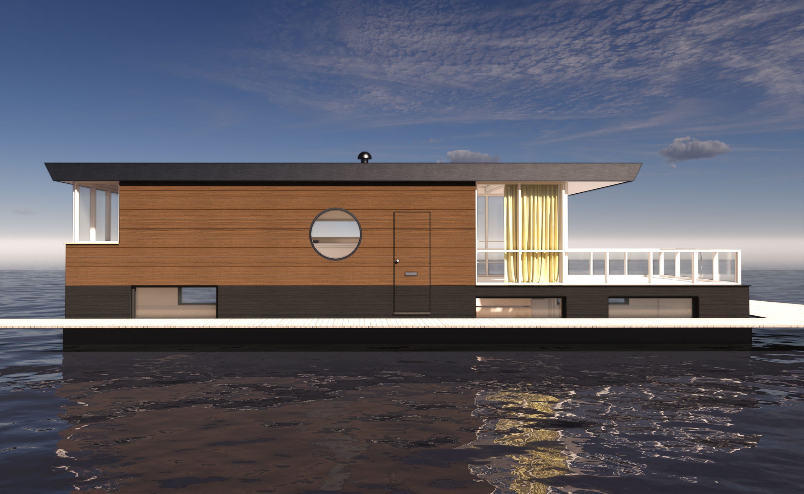 Het idee is een woonboot te bouwen die voelt als een privé strandpaviljoen. Een licht, plezierig huis van hout op de plassen; wat een vrijheid! Er is een intieme woonruimte met lounge bank, een open woonkeuken met aansluitend groot terras en er zijn comfortabele slaap- en badkamers. De horizontale lijnen in gevel, kozijnen, dakoverstek en hekwerken maken dat de ark meedoet in het plassenlandschap, meedoet met de horizontaliteit van ons platte land. De vloerhoogtes variëren om de benedenruimtes van goed daglicht te voorzien en zo het beste te halen uit de toegestane hoogtemaat.