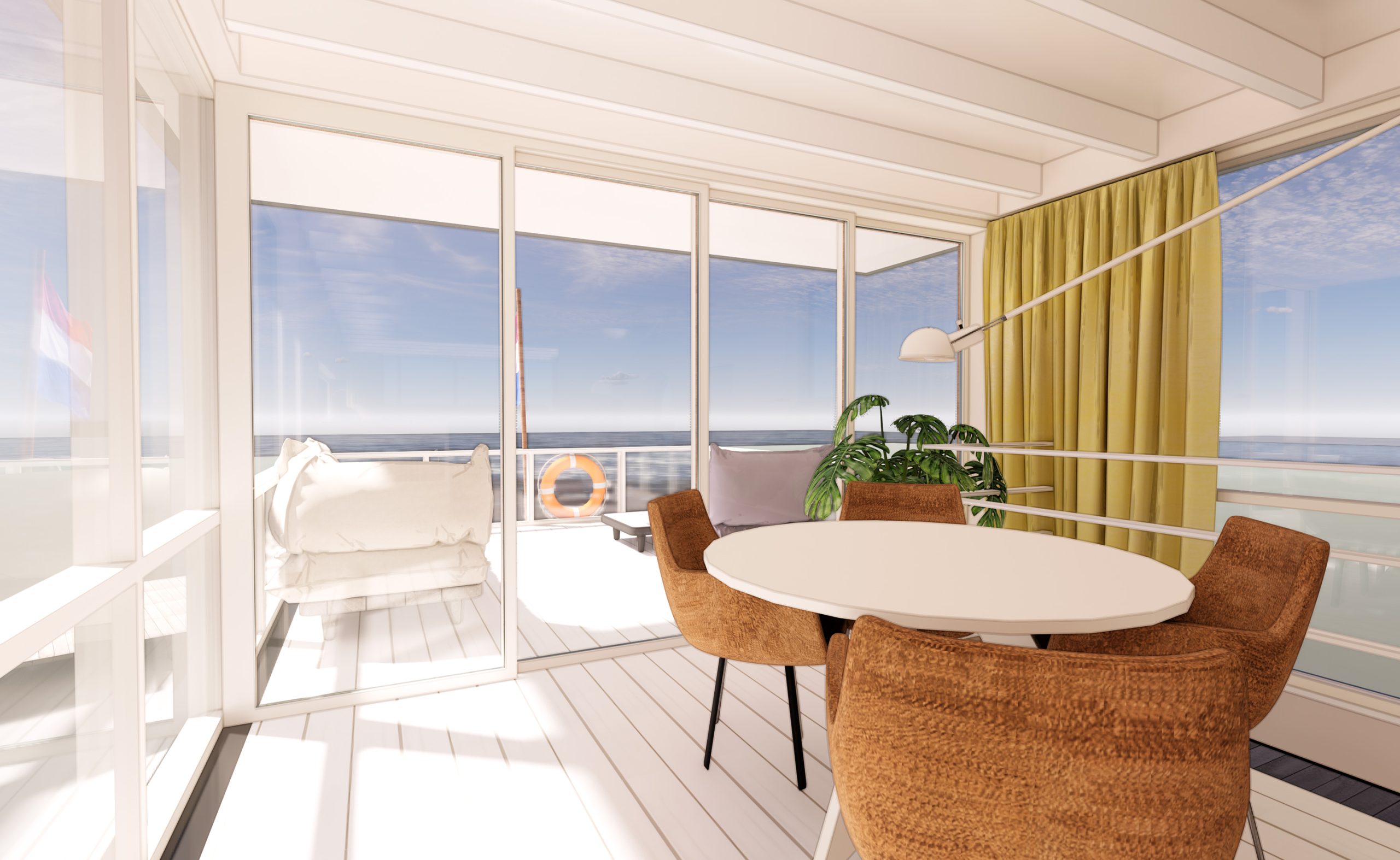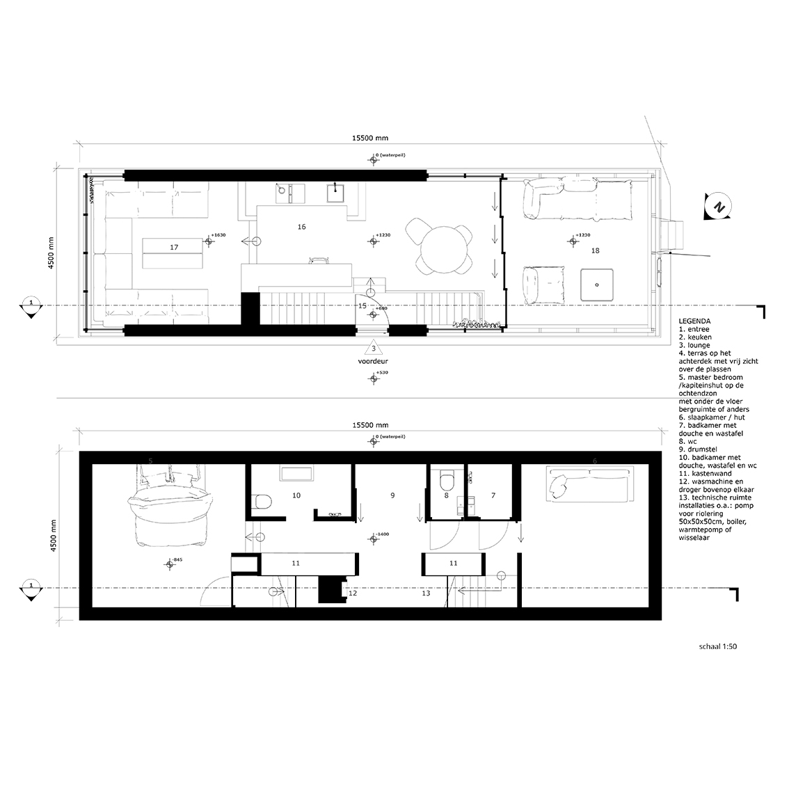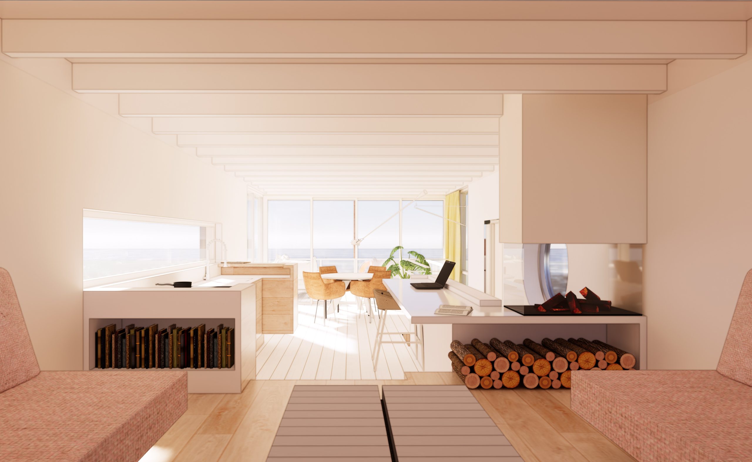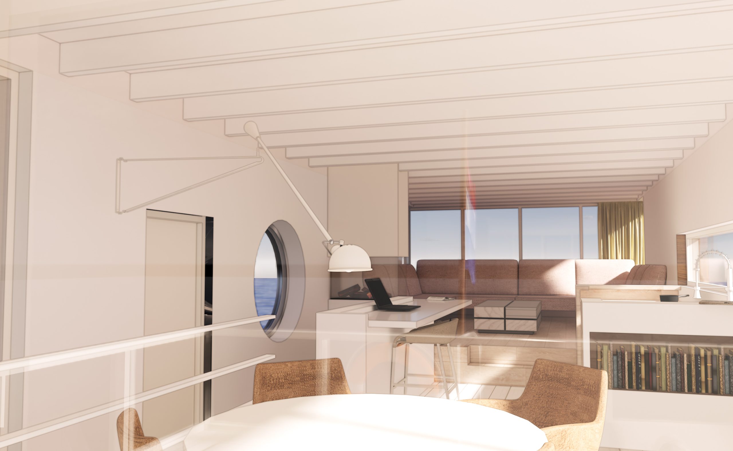 Het idee is een woonboot te bouwen die voelt als een privé strandpaviljoen. Een licht, plezierig huis van hout op de plassen; wat een vrijheid! Er is een intieme woonruimte met lounge bank, een open woonkeuken met aansluitend groot terras en er zijn comfortabele slaap- en badkamers. De horizontale lijnen in gevel, kozijnen, dakoverstek en hekwerken maken dat de ark meedoet in het plassenlandschap, meedoet met de horizontaliteit van ons platte land. De vloerhoogtes variëren om de benedenruimtes van goed daglicht te voorzien en zo het beste te halen uit de toegestane hoogtemaat.