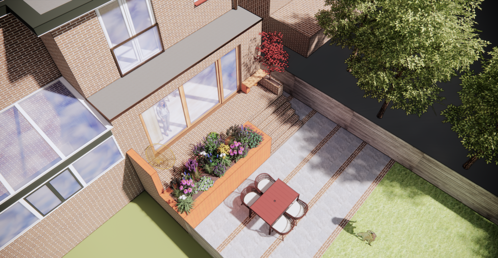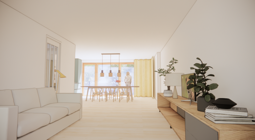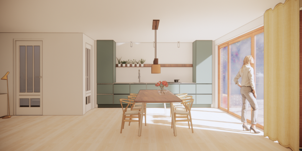 Het idee is de verouderde dijkwoning aan de Pijnackerse Vaart veel beter te maken door vierkante meters toe te voegen, door van de begane grond een open plan te maken en door raam, deur en het trappetje naar de tuin te vervangen door een brede glazen pui en een terras met brede trap de tuin in.