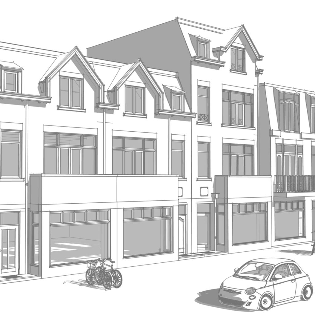 Het idee is dit karakteristieke herenhuis uit te breiden; een verdieping erbovenop, uitbreidingen aan de achtergevel én terrassen aan de achtergevel. Zo worden de woningen en de winkelruimte vergroot en meerwaarde gecreëerd.